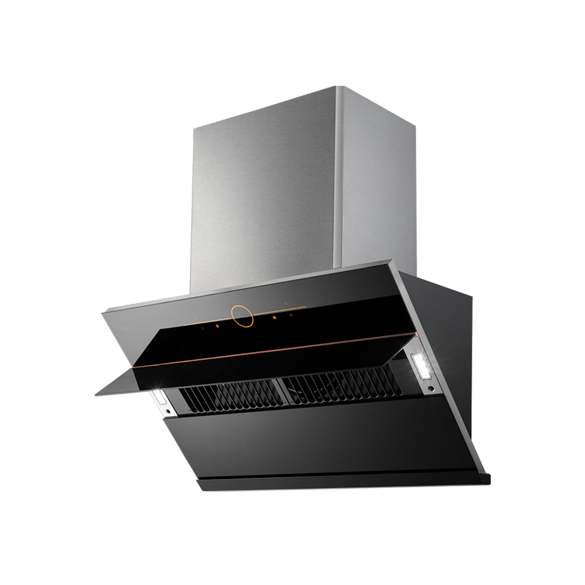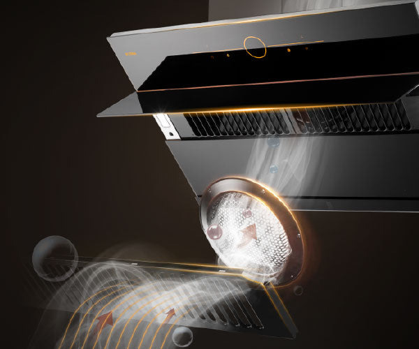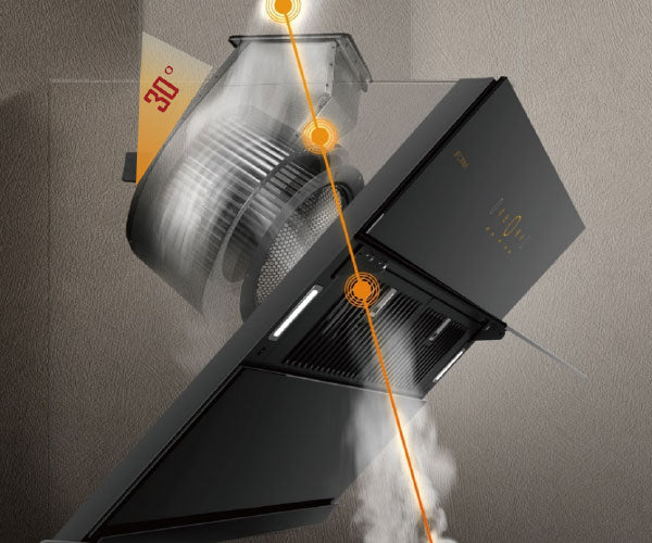 The fan tilt angle is adjusted to 30° in design, so that 4 crucial points (cooktop, air inlet, volute and air outlet) can form a straight line for direction suction and fume exhaustion.