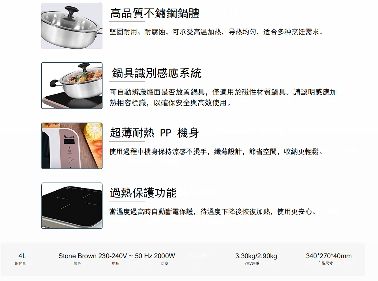 功率範圍為 200 瓦至 2000 瓦,以 200 瓦為間隔進行調節,實現精準穩定的烹飪效果。