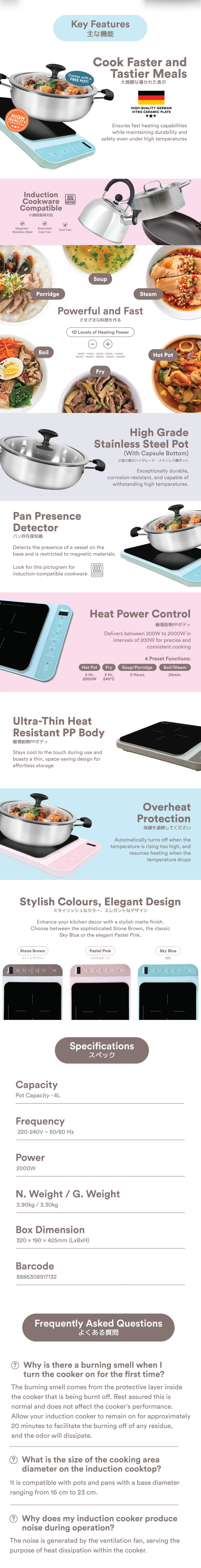 這款產品有三種令人驚豔的霧面顏色可選,超薄耐熱的機身觸感涼爽,輕鬆融入任何廚房。此外,它還附贈一個高品質不銹鋼鍋,幫助您將烹飪技巧提升到新的高度。